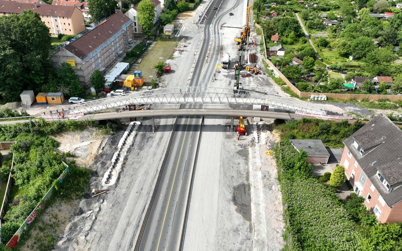 Am Wochenende werden die alten Radwegebrücken Laerer Landweg und Pleistermühlenweg über der B51 abgebrochen. Als Ersatz stehen provisorische Brücken direkt neben den alten Bauwerken zur Verfügung. Die Bauwerke werden nacheinander abgebrochen, damit auch während der Arbeiten durchgehend immer eine der beiden Brücken für Radfahrende und Fußgänger:innen zur Verfügung steht.