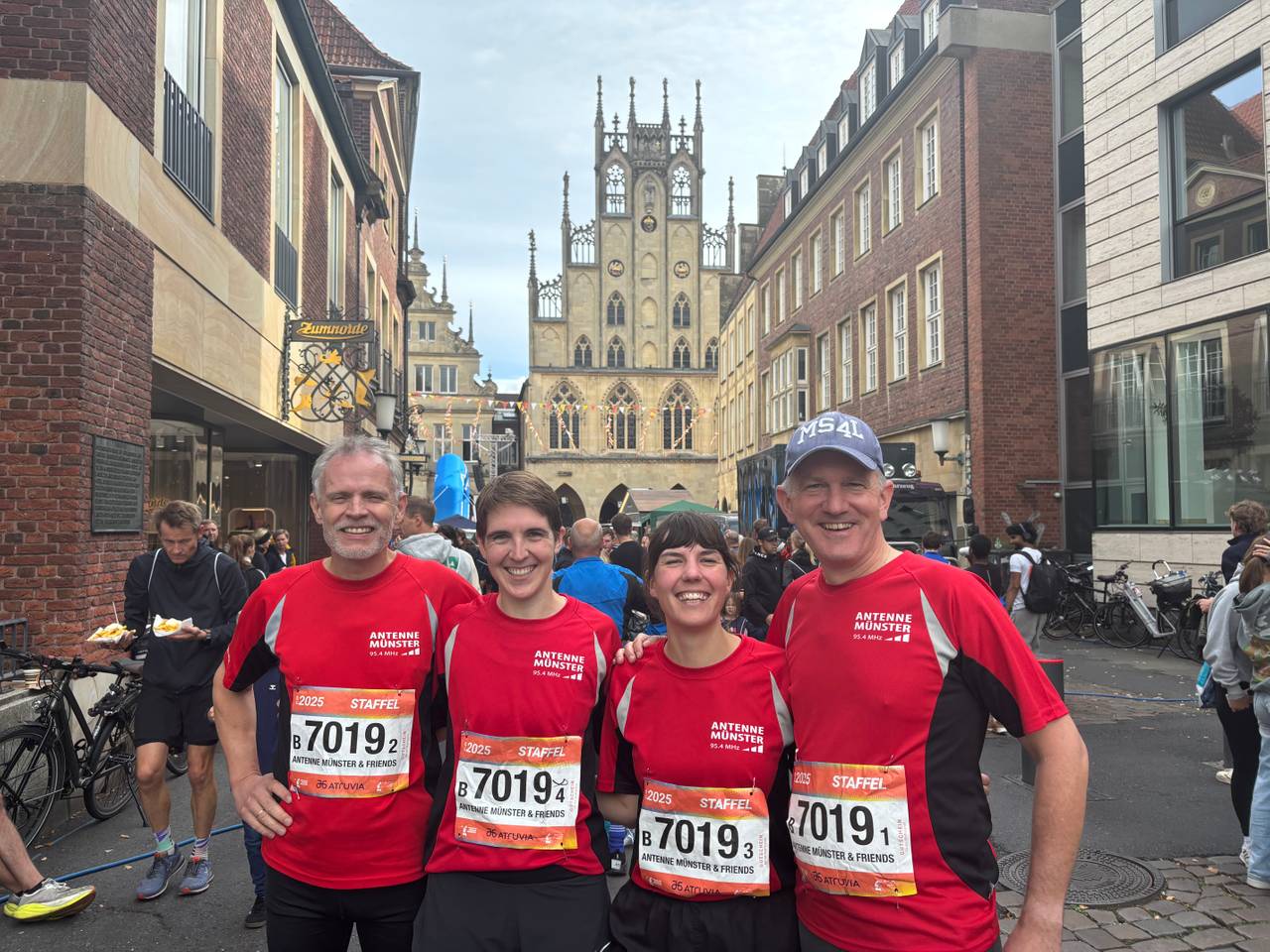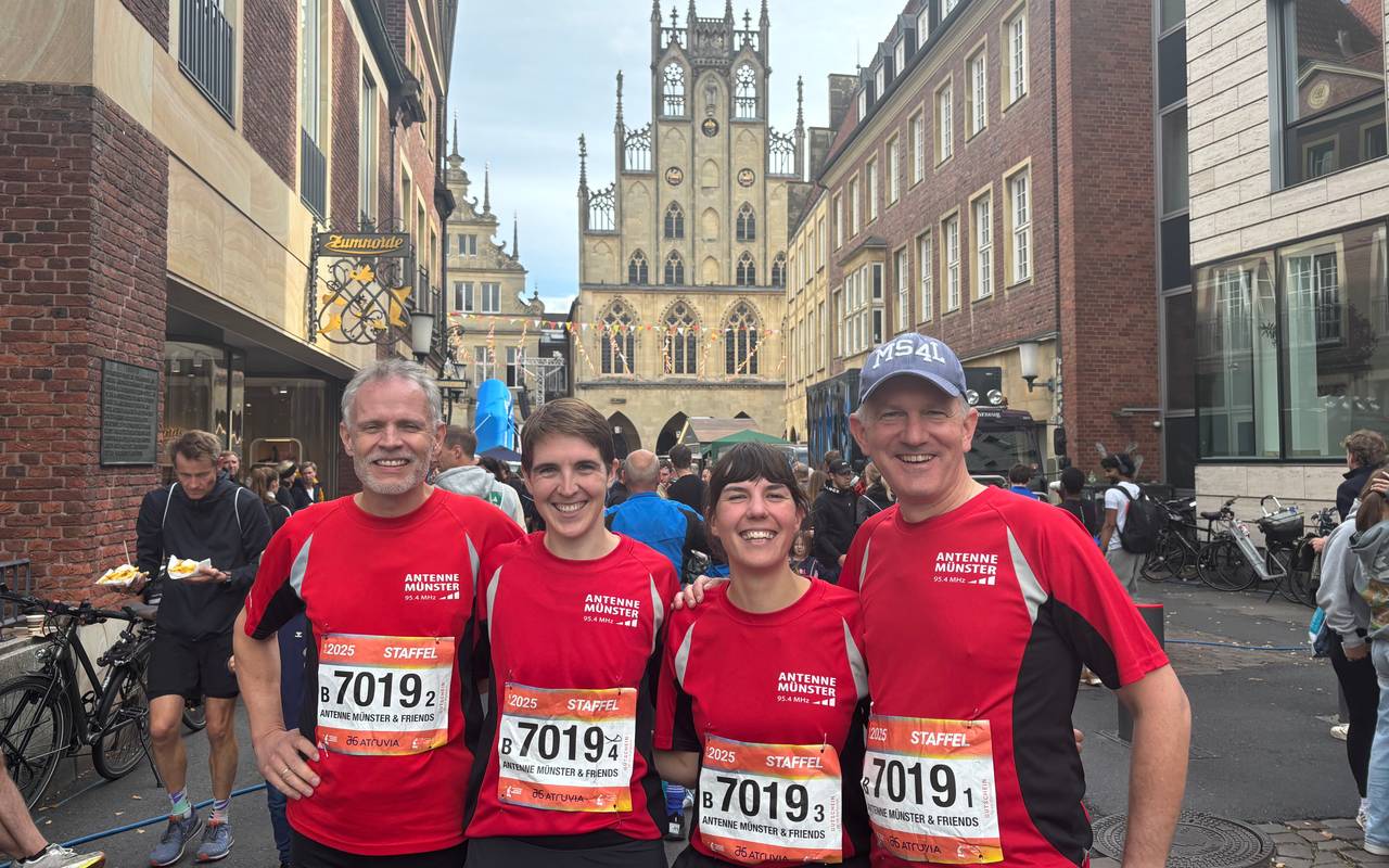 Für unsere Staffel haben wir uns dieses Jahr starke Unterstützung von euch geholt. Christina und Christian aus unserem Team und ANTENNE MÜNSTER-Hörer Peter und ANTENNE MÜNSTER-Hörerin Ellen wuchsen im gemeinsamen Training zu einem tollen Staffel-Team zusammen. Peter ging für unser Team am Schlossplatz an den Start, und Ellen lief nach 03:54:44 Stunden im Ziel ein. Platz 195 von 611 Mixed-Staffeln - Respekt!