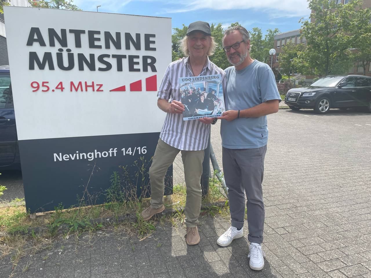 sagt Steffi Stephan, als er mit ANTENNE MÜNSTER-Chefredakteur Stefan Nottmeier vor dem Sendergebäude von ANTENNE MÜNSTER am Nevinghoff steht. In der Hand hält er das Album "Alles klar auf der Andrea Doria", dessen Songs hier in Münster entstanden sind.