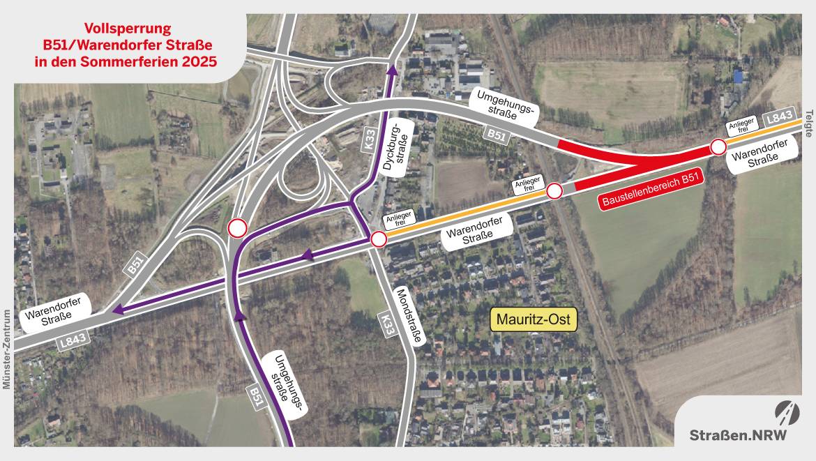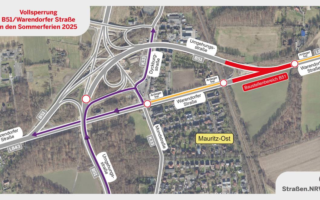 Während der Sommerferien wurde der Verkehr weiträumig umgeleitet. Nur Radler:innen, Linienbusse und Rettungsdienste konnten die Baustelle zwischen der Kreuzung Mondstraße und Einmündung der B 51 passieren. Mit der Vollsperrung wollte der Landesbetrieb Straßen.NRW die Gesamtbelastung für alle deutlich reduzieren. Gerade in der ersten Ferienwoche kamen noch Umleitungen durch andere Ferienbaustellen dazu, wie etwa die ebenfalls voll gesperrte Kanalbrücke des Schifffahrter Damms bei der Schleuse. Ursprünglich war geplant, rund neun Monate lang eine Baustellenampel aufzustellen, aber das hätte zu noch mehr Staus geführt.