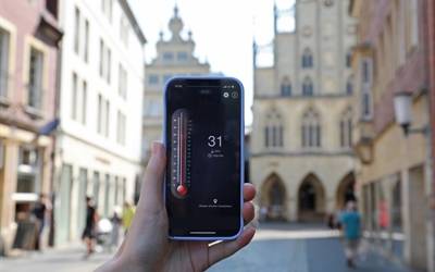 Die Stadt hat spezielle Aufkleber entwickelt, die Tipps für den richtigen Umgang mit Hitze geben. Ihr könnt sie euch im Haus der Nachhaltigkeit an der Hammer Straße 1 abholen, die sogenannten Hitzewarner. Wenn die Raumtemperatur auf mehr als 28 Grad Celsius steigt, verändert der Aufkleber die Farbe. Bei normaler Temperatur ist er noch schwarz, wird es dann aber zu warm, erscheint eine rote Hitzewarnung. Dann erscheint auch ein QR-Code. Und wenn ihr den scannt, kommt ihr zu einer Seite von der Stadt, auf der Tipps zusammengefasst sind, wie wir uns bei Hitze am besten verhalten.