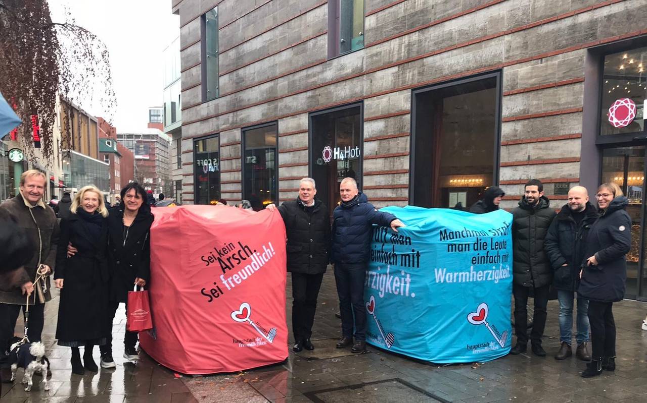 Die Abschlussaktion der "Woche der Freundlichkeit" von Aktionskünstler Thomas Nufer (3.v.l.).