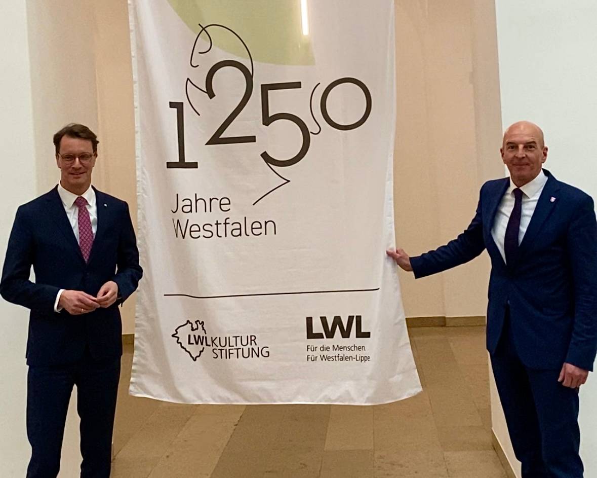 "1.250 Jahre Westfalen": Dieses Jubiläum wird in diesem Jahr in der Region kräftig gefeiert. Zum Auftakt hat NRW-Ministerpräsident Hendrik Wüst gemeinsam mit LWL Direktor Georg Lunemann die extra für das Festjahr entworfene Flagge im LWL-Hauptsitz ausgerollt.