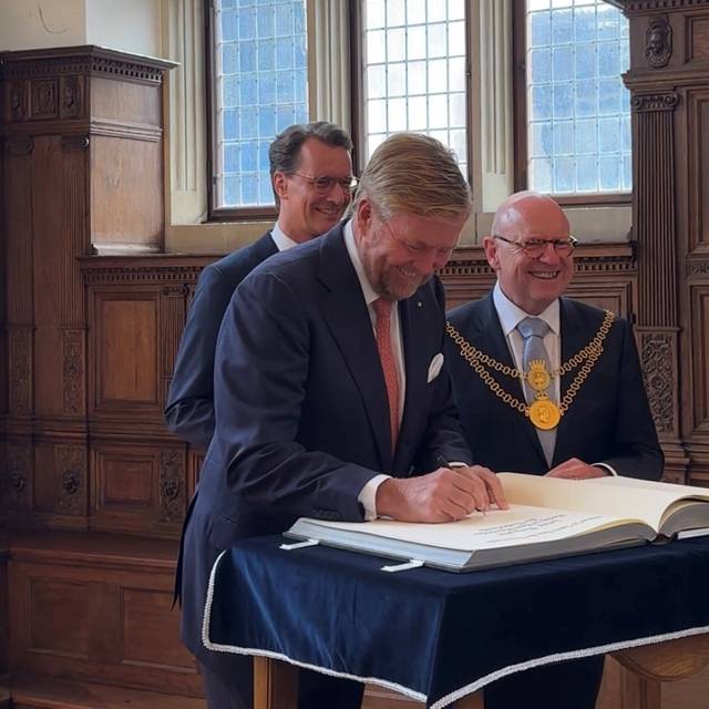 Seit 1995 sind das Zentrum für Niederlande-Studien, das Institut für niederländische Philologie und eine Bibliothek mit der größten Sammlung niederländischer Literatur und Publikationen in Deutschland in dem Haus der Niederlande anzufinden. Im Haus der Niederlande schaut sich König Willem-Alexander die Ausstellung "Niederlande in 3D" an. Außerdem erhält er Einblicke in das Projekt "Euregionale Bildungskette". Abschließend trifft der König Vertreter:innen von Organisationen, die mit dem Haus der Niederlande zusammenarbeiten. Prof. Dr. Jacco Pekelder, Direktor des Zentrums für Niederlande-Studien der Universität Münster: