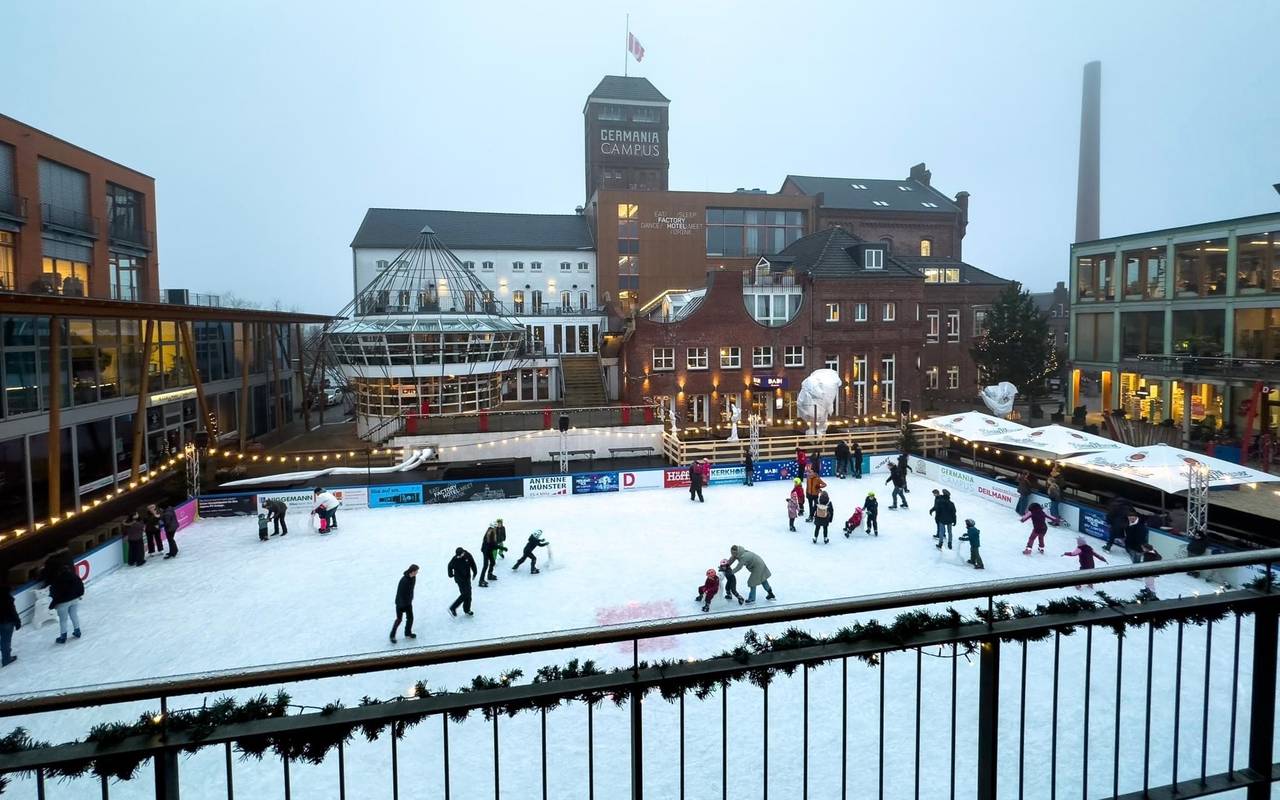 Falls es mit dem Schlittschuhlaufen auf dem Aasee auch in diesem Winter nicht klappt - Wir haben eine Alternative. Am Germania Campus gibt es die "Winterzeit" mit Eisbahn.
