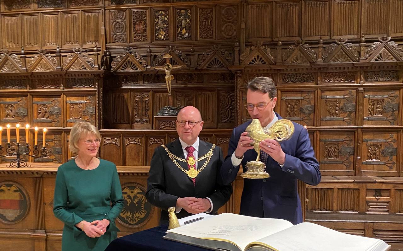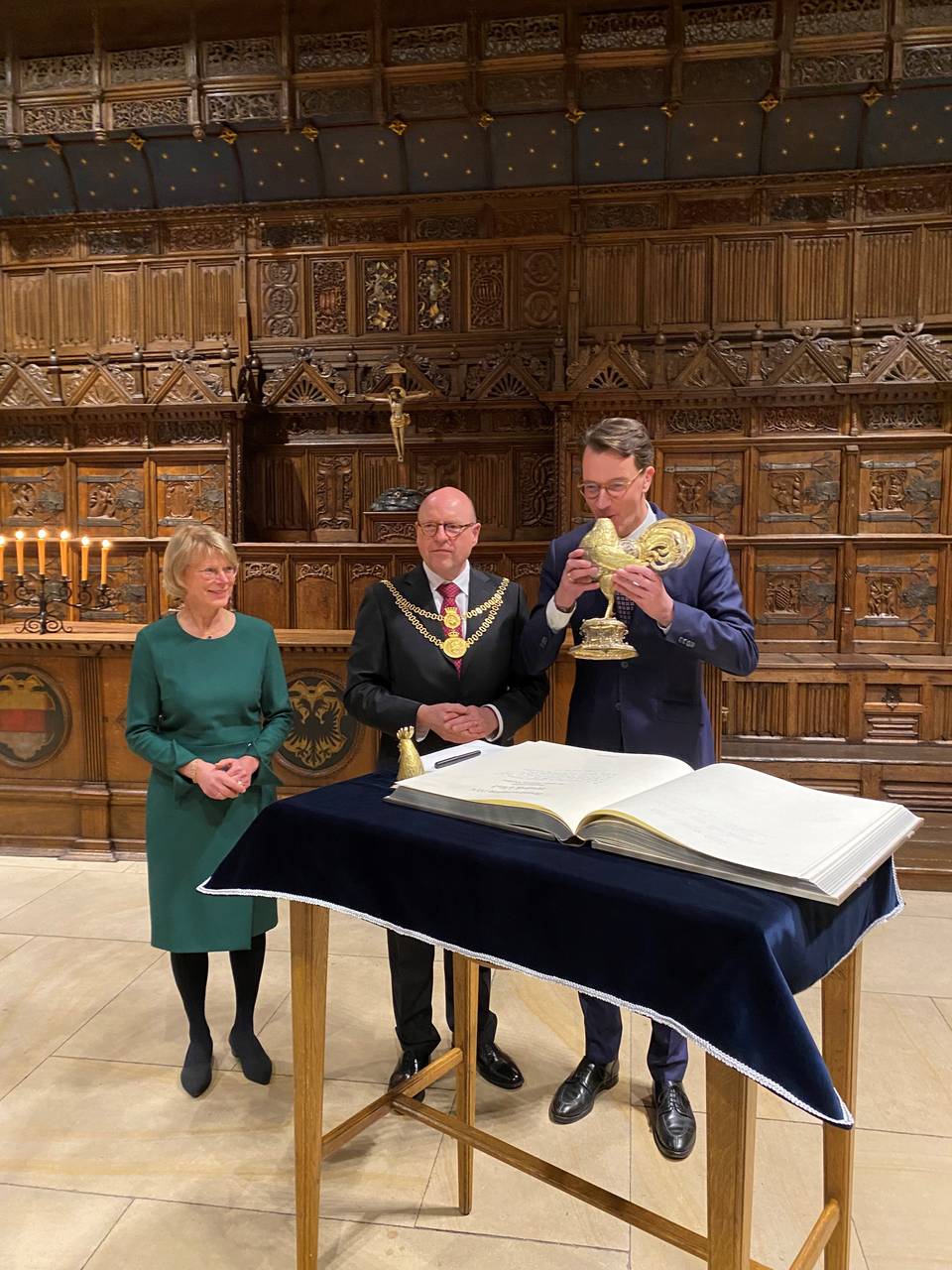 Vor dem Neujahrsempfang hatte sich Minsterpräsident Wüst im Friedenssaal des Rathauses ins goldene Buch der Stadt eingetragen und einen Schluck Wein aus dem goldenen Hahn genommen.