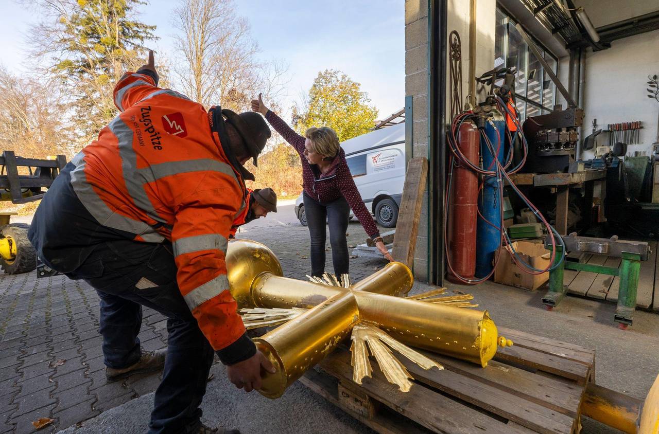 Angekommen im Tal, wurde das Kreuz auf einem Anhänger in die Werkstatt der Kunstschmiedin Andrea Würzinger nach Eschenlohe gebracht, deren Vater das Kreuz 1993 gebaut hat. Würzinger wird die dicke Schicht Aufkleber vorsichtig entfernen, den Untergrund schleifen und anschließend Lack und neues Blattgold aufbringen.