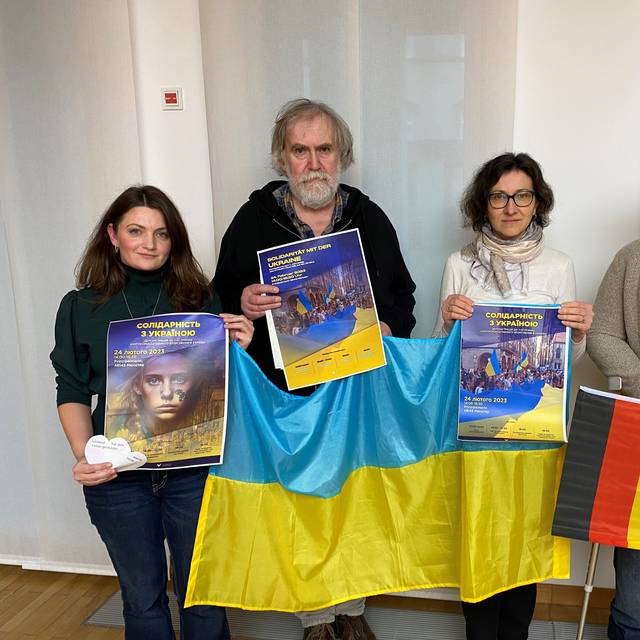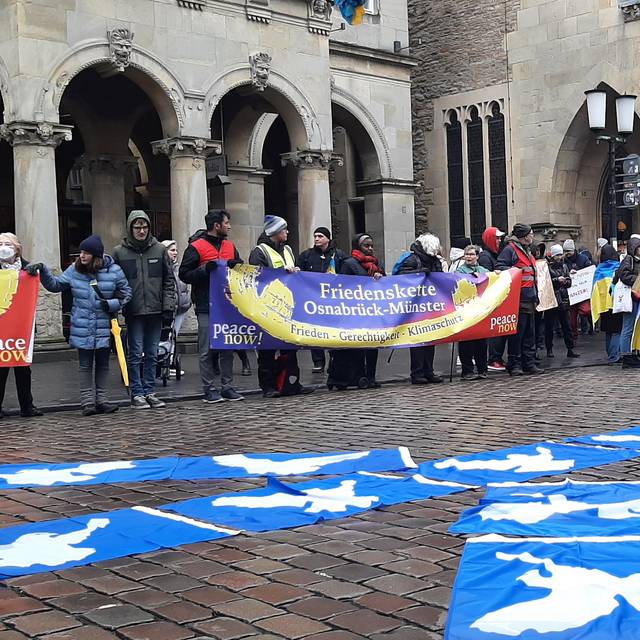 Am Freitagabend hatte die Stadt bereits alle Bürger:innen, die sich solidarisch mit der Ukraine zeigen wollten, zu einer Veranstaltung im Festsaal des Rathauses eingeladen. Bei der Veranstaltung gab es eine Videobotschaft von Iryna Shum, der Generalkonsulin der Ukraine mit Sitz in Düsseldorf. Außerdem schilderte Serhii Morhunov, der Bürgermeister von Münsters ukrainischer Solidaritätspartnerstadt Winnyzja, per Video die Lage vor Ort.
